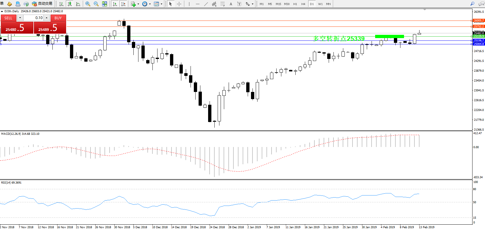 交易策略:25339上方看涨,目标25752、26005
