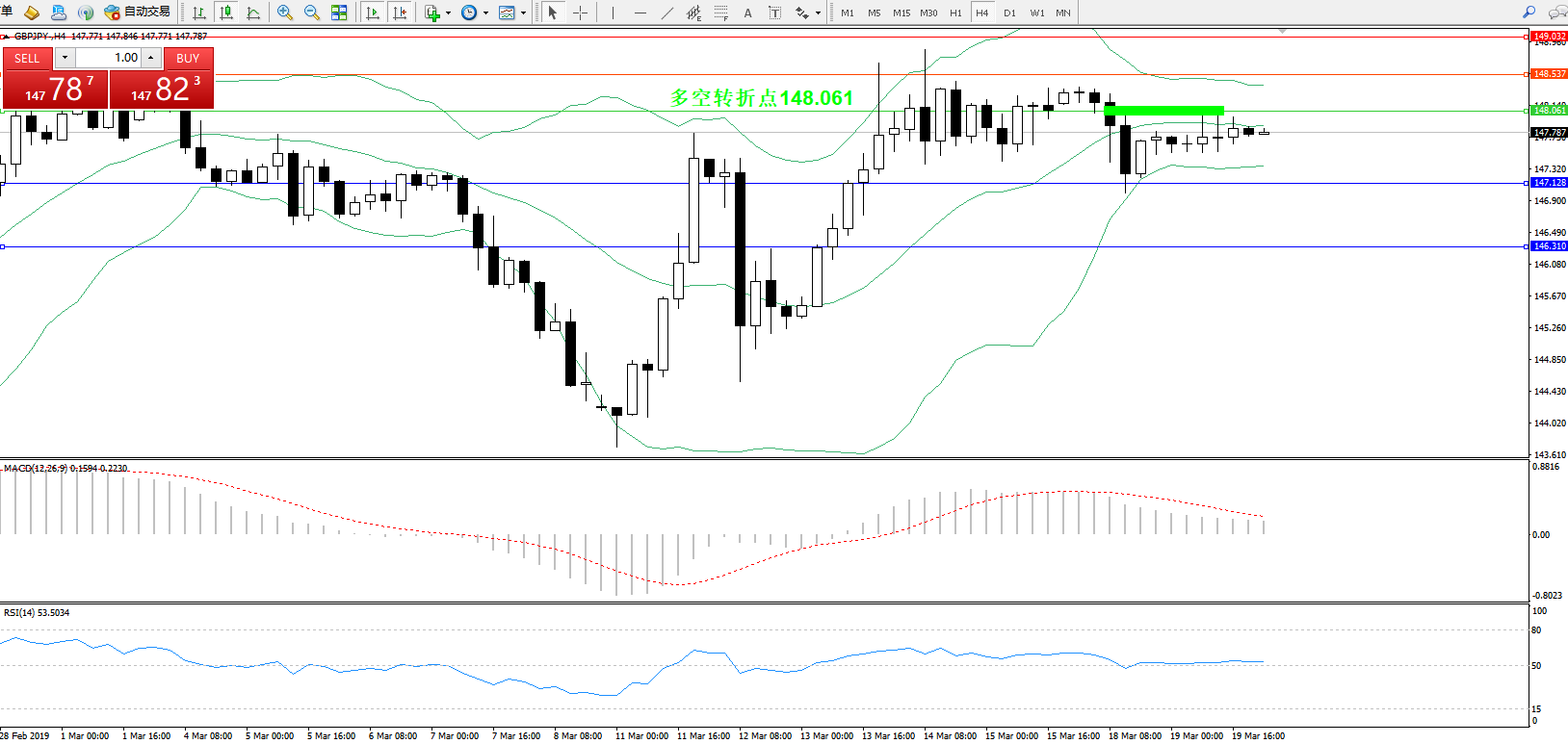 交易策略:148.061下方看跌,目标147.128、146.310
