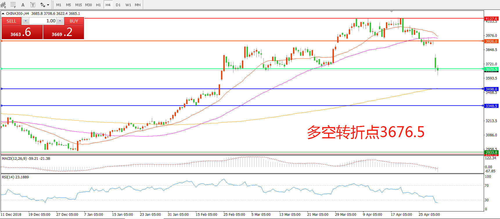 4小时图看,沪深300指数跳空低开一路下挫,短期偏空走势明显,21均线有下穿形成死叉迹象,MACD绿柱增加,RSI指标向下,日内以空头思路为主,切忌追多。