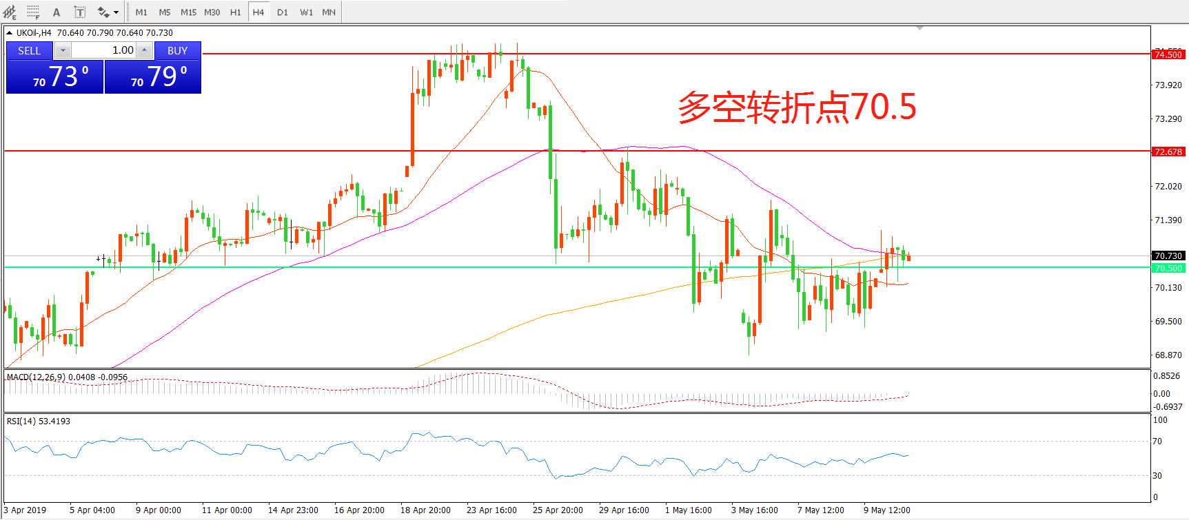 4小时图看,油价震荡企稳,振幅逐渐收窄,上方70.5形成短期阻力,短期均线逐渐走平,MACD绿柱减少, RSI指标走平,日内延续震荡概率较大,重点关注70.5一线得失。