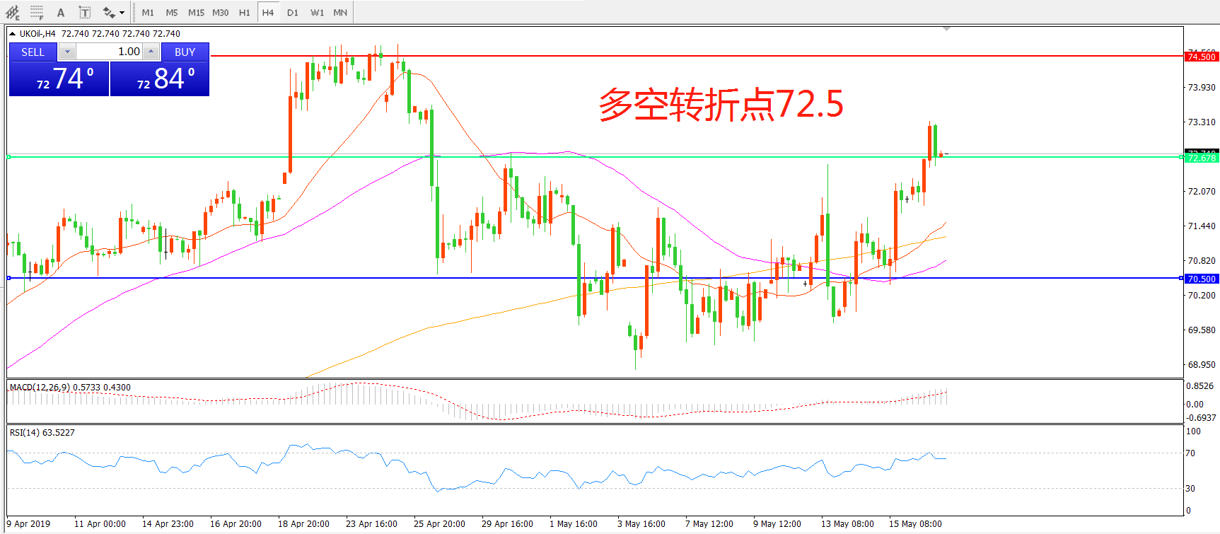 4小时图看,油价经过整理后长阳上升,整体走势十分强势,短期均线拐头向上,MACD红柱增加,日内延续震荡的概率较大,重点关注72.50一线得失