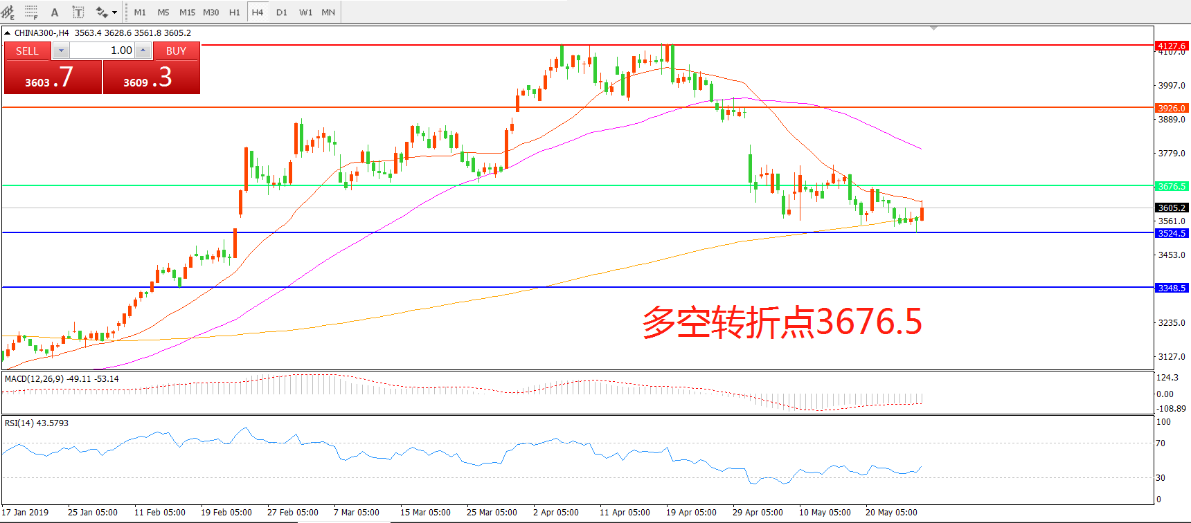 4小时图看,沪深300指数在跌破3676.5整理后震荡下行,振幅逐渐收窄, 200均线成为短期支撑,MACD绿柱缩短,RSI指标拐头向下,日内以震荡下行思路对待。
