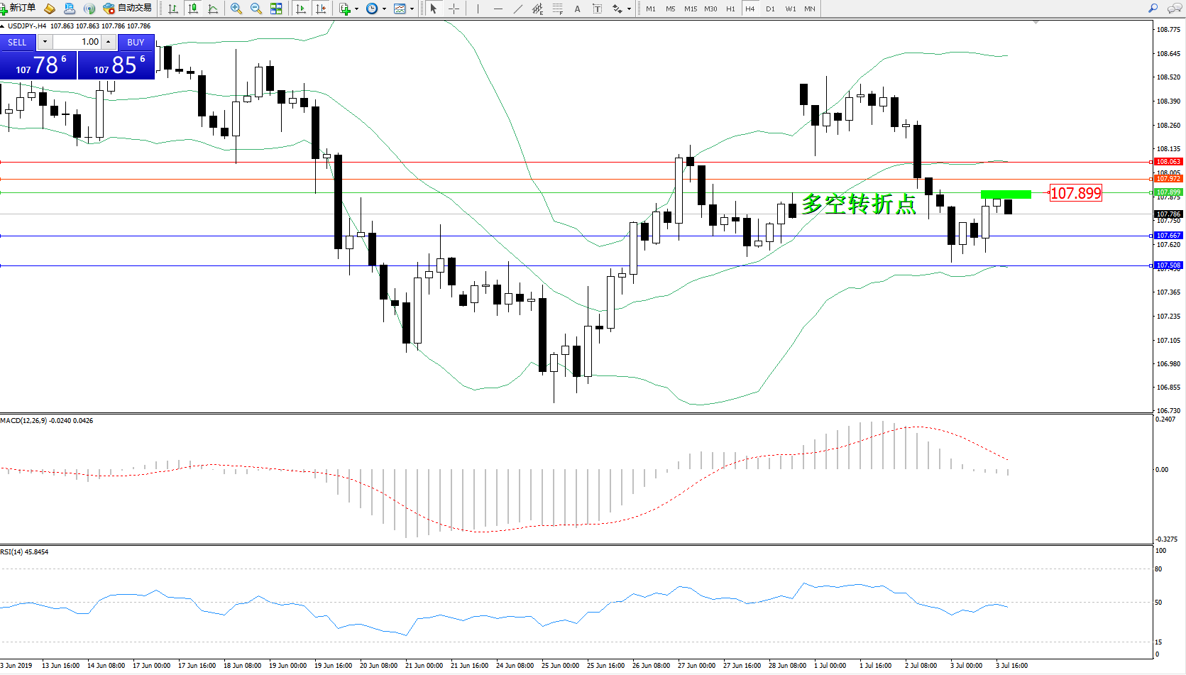 交易策略:107.899下方看跌,目标107.667、107.508