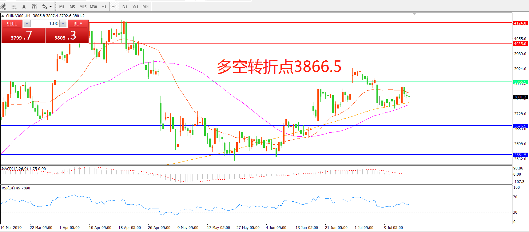 4小时图看,沪深300指数以200周期均线为支撑一度冲高,小幅回落后延续震荡,MACD红柱缩短,RSI指标走平,日内震荡概率较大。