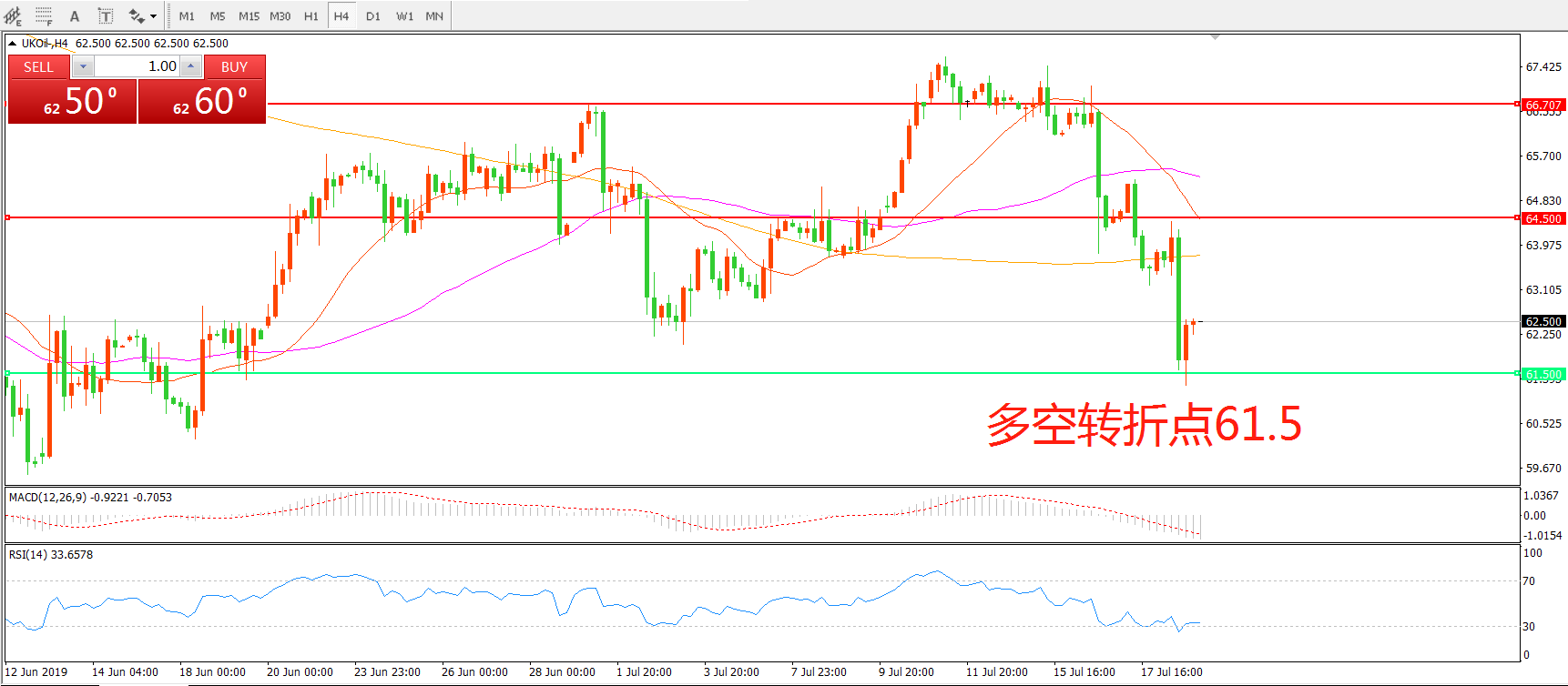 4小时图看,油价长阴破位,无力收复,200周期均线形成上方阻力, RSI指标走平,日内小幅反弹成为可能。