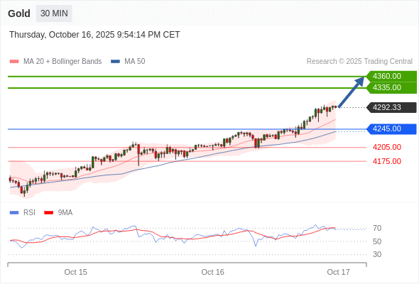 在 4245.00 之上,看涨,目标价位为 4335.00 ,然后为 4360.00 。