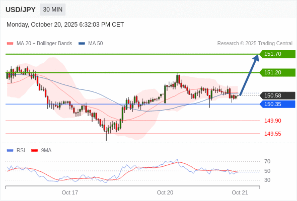 在 150.35 之上,看涨,目标价位为 151.20 ,然后为 151.70 。