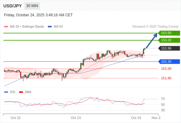 在 152.30 之上,看涨,目标价位为 153.20 ,然后为 153.50 。