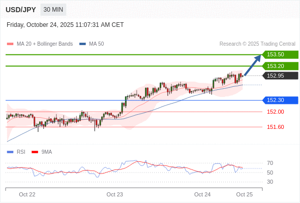 在 152.30 之上,看涨,目标价位为 153.20 ,然后为 153.50 。