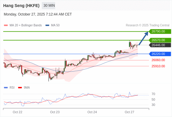 交易策略: 在 26220.00 之上,看涨,目标价位为 26570.00 ,然后为 26790.00 。