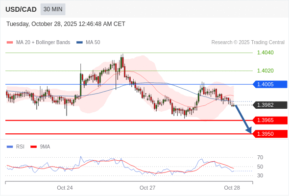在 1.4005 之下,看跌,目标价位为 1.3965 ,然后为 1.3950 。