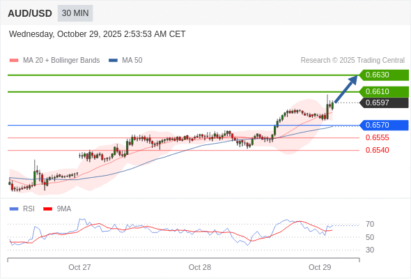在 0.6570 之上,看涨,目标价位为 0.6610 ,然后为 0.6630 。