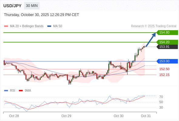 在 153.00 之上,看涨,目标价位为 154.20 ,然后为 154.80 。