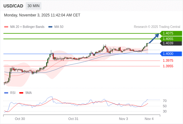在 1.4000 之上,看涨,目标价位为 1.4055 ,然后为 1.4075 。