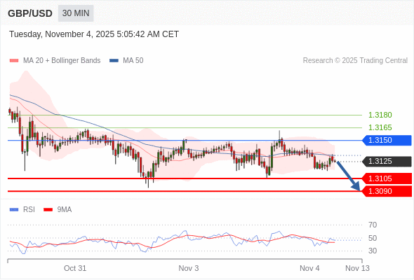 交易策略: 在 1.3150 之下,看跌,目标价位为 1.3105 ,然后为 1.3090 。