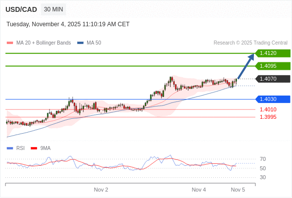 在 1.4030 之上,看涨,目标价位为 1.4095 ,然后为 1.4120 。