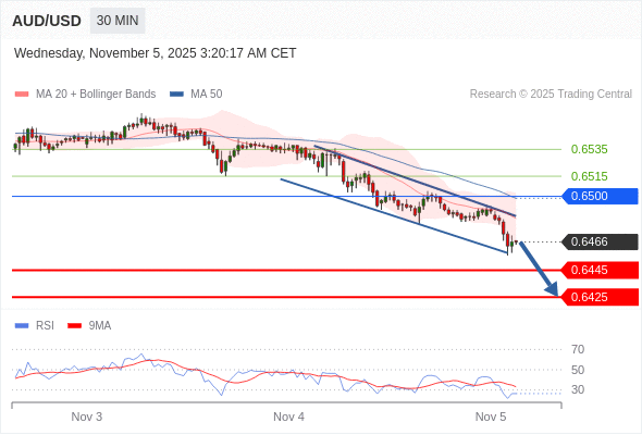 在 0.6500 之下,看跌,目标价位为 0.6445 ,然后为 0.6425 。