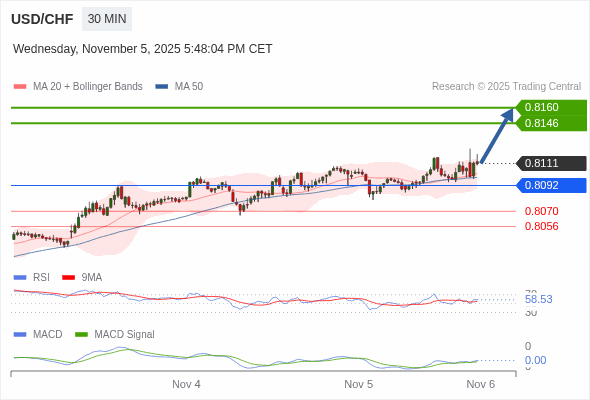 美元/瑞郎 当日内 : 看涨,当 0.8092 为支撑位。