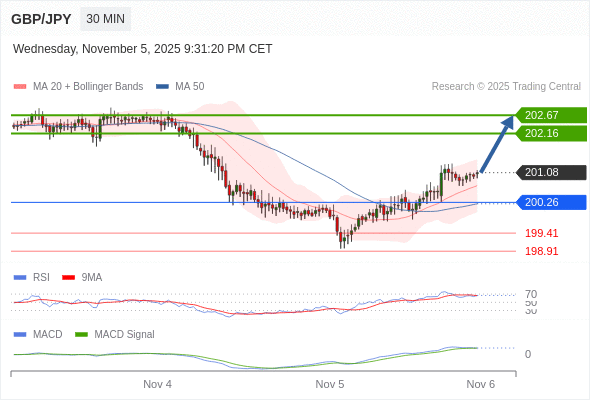英镑/日元 当日内: 看涨,当 200.26 为支撑位。