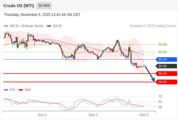 交易策略: 在 60.00 之下,看跌,目标价位为 59.25 ,然后为 58.80 。