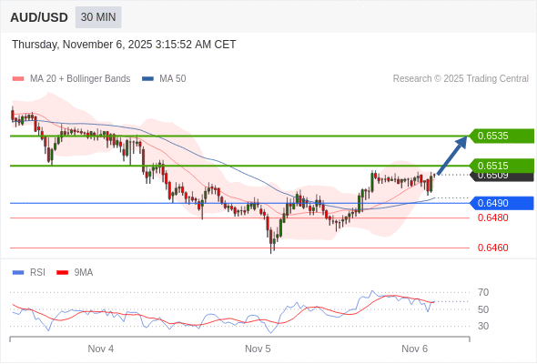 在 0.6490 之上,看涨,目标价位为 0.6515 ,然后为 0.6535 。