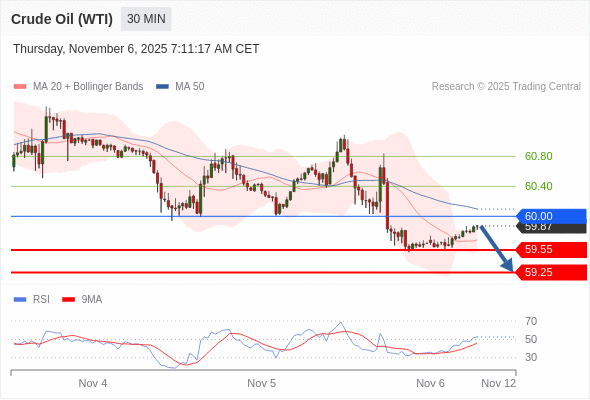 交易策略: 在 60.00 之下,看跌,目标价位为 59.55 ,然后为 59.25 。