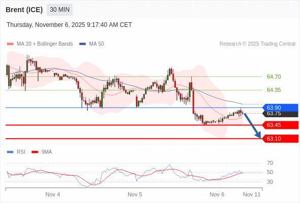 在 63.90 之下,看跌,目标价位为 63.45 ,然后为 63.10 。