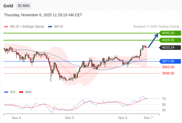 在 3977.00 之上,看涨,目标价位为 4028.00 ,然后为 4045.00 。