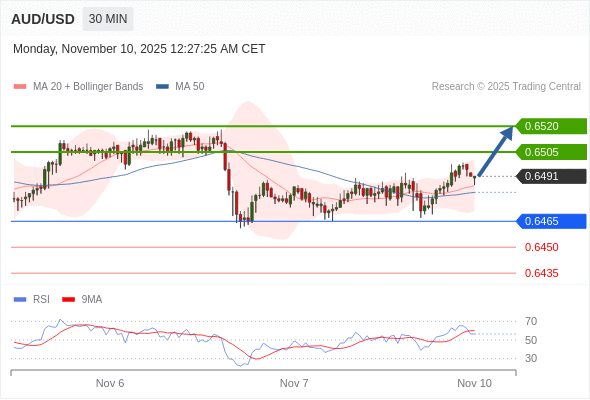 在 0.6465 之上,看涨,目标价位为 0.6505 ,然后为 0.6520 。