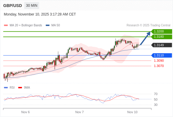 英镑/美元 当日内: 在1.3110之上,看涨。