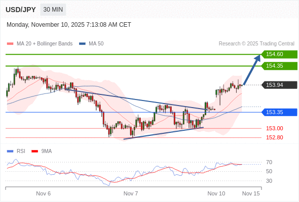 在 153.35 之上,看涨,目标价位为 154.35 ,然后为 154.60 。