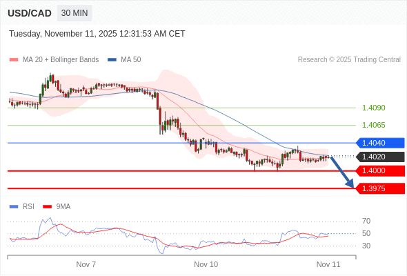 在 1.4040 之下,看跌,目标价位为 1.4000 ,然后为 1.3975 。