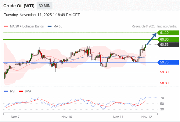 在 59.75 之上,看涨,目标价位为 60.80 ,然后为 61.10 。