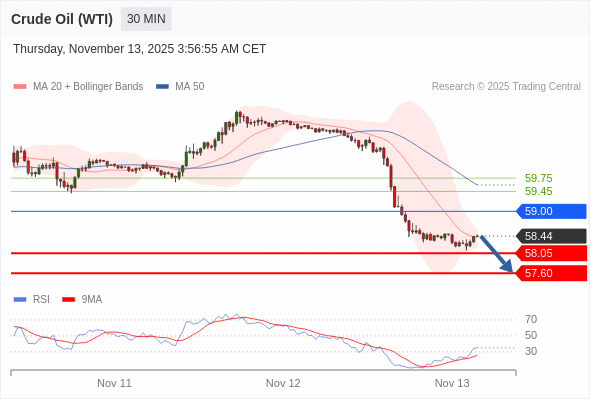 在 59.00 之下,看跌,目标价位为 58.05 ,然后为 57.60 。