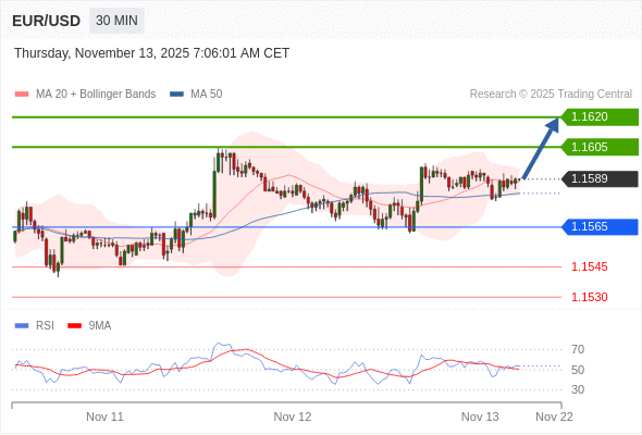 在 1.1565 之上,看涨,目标价位为 1.1605 ,然后为 1.1620 。