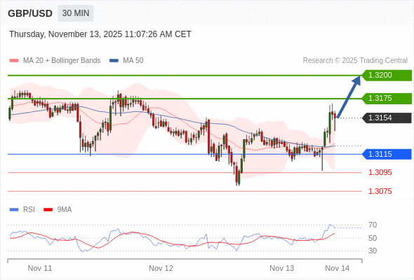 在 1.3115 之上,看涨,目标价位为 1.3175 ,然后为 1.3200 。