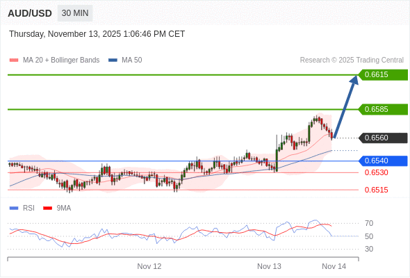在 0.6540 之上,看涨,目标价位为 0.6585 ,然后为 0.6615 。