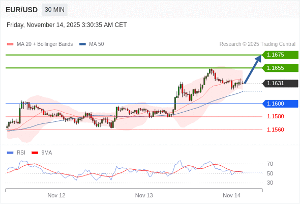 在 1.1600 之上,看涨,目标价位为 1.1655 ,然后为 1.1675 。