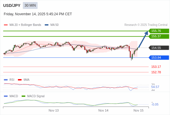 美元/日元 当日内 : 看涨,当 153.84 未被跌破。