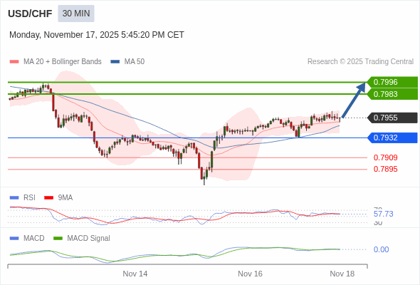 美元/瑞郎 当日内 : 看涨,当 0.7932 为支撑位,目标定在0.7996。
