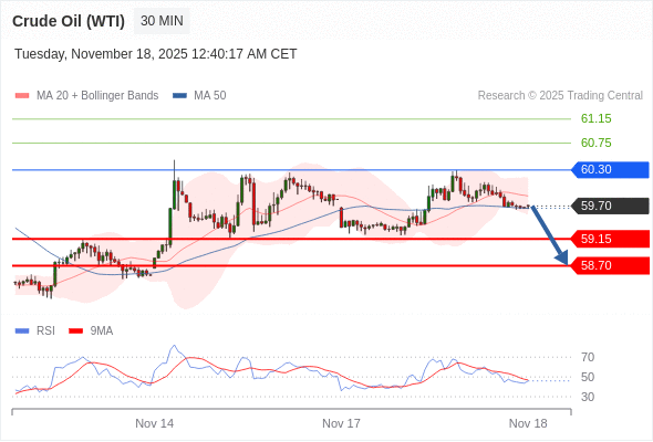 在 60.30 之下,看跌,目标价位为 59.15 ,然后为 58.70 。