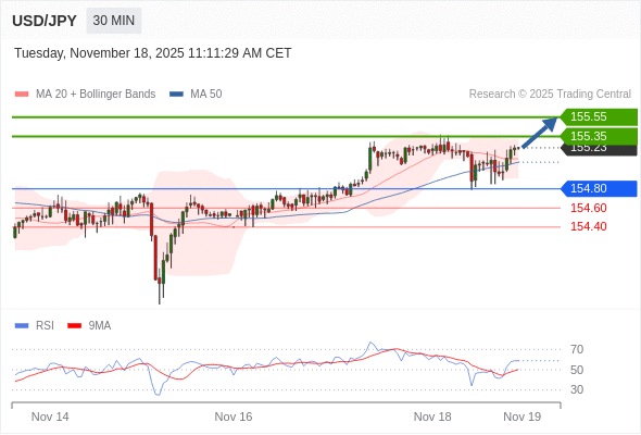 在 154.80 之上,看涨,目标价位为 155.35 ,然后为 155.55 。