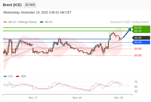 在 64.40 之上,看涨,目标价位为 65.10 ,然后为 65.30 。