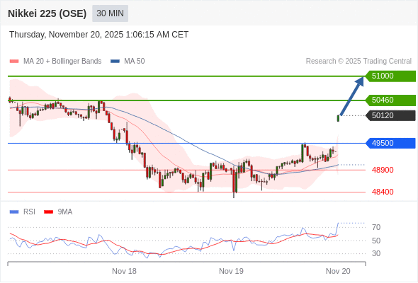 在 49500 之上,看涨,目标价位为 50460 ,然后为 51000 。