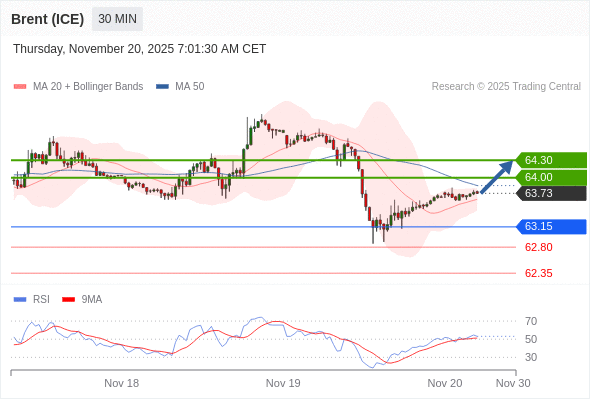 在 63.15 之上,看涨,目标价位为 64.00 ,然后为 64.30 。