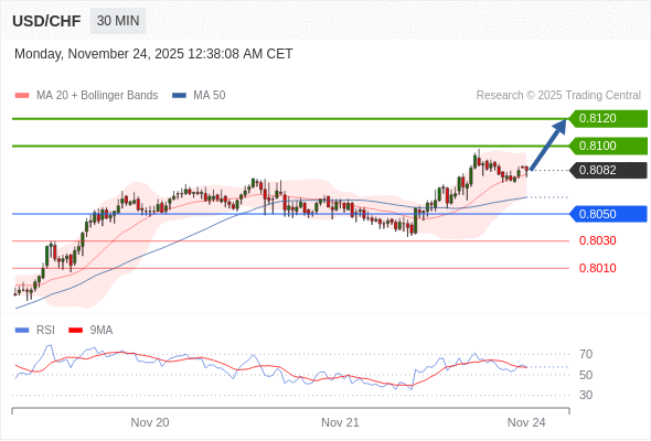 在 0.8050 之上,看涨,目标价位为 0.8100 ,然后为 0.8120 。