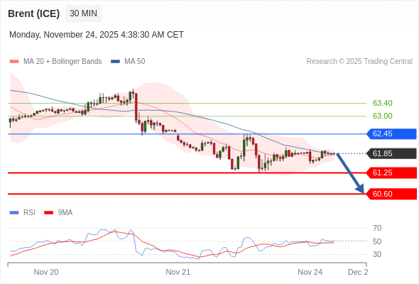 交易策略: 在 62.45 之下,看跌,目标价位为 61.25 ,然后为 60.60 。