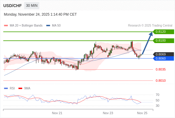 在 0.8060 之上,看涨,目标价位为 0.8100 ,然后为 0.8120 。