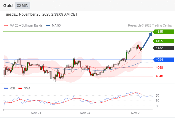 在 4094 之上,看涨,目标价位为 4155 ,然后为 4185 。