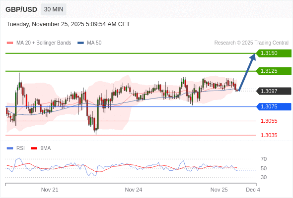 在 1.3075 之上,看涨,目标价位为 1.3125 ,然后为 1.3150 。